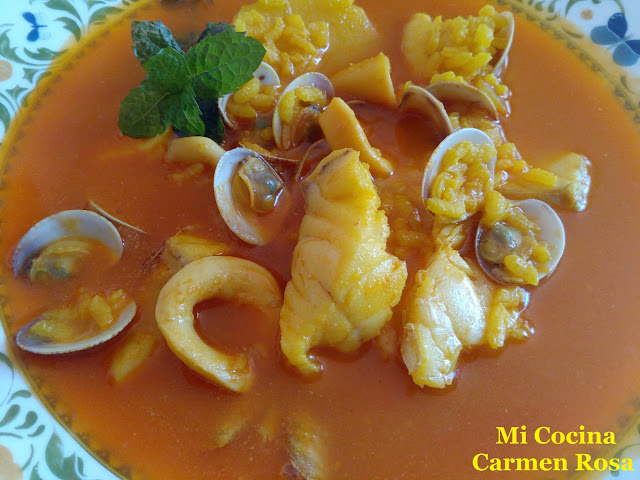 CAZUELA DE ARROZ CALDOSO CON PESCADO, ALMEJAS Y CALAMARES
