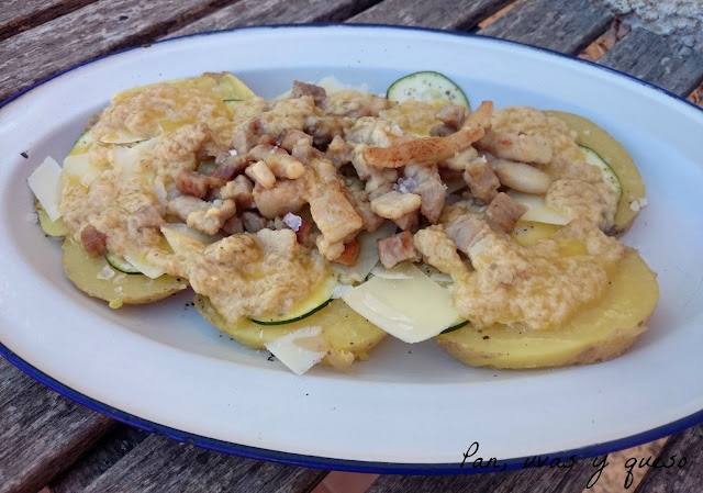 Patata: 800 gramos.CalabacÃn: 200 gramos.Panceta fresca: 200 gramos.Queso Parmesano: 100 gramos.Aceite de oliva virgen extra.Sal en escamas.Pimienta negra.