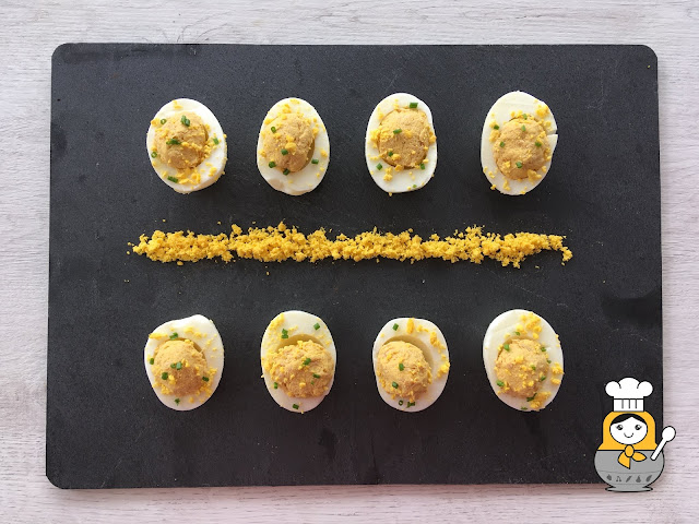 Sal¿Cómo lo hago"Comenzamos por cocer los huevos. Este es sin duda el paso clave de esta receta, porque lo suyo es que consigamos unos huevos vistosos. Ponemos a hervir un cazo con agua y sal y cuando comience a hervir el agua (y no antes) colocamos con cuidado los huevos en el cazo. Dejamos cocer los huevos 10 minutos y los retiramos del fuego. Inmediatamente, los introducimos en un bol con agua frÃa y (a ser posible) algún cubito de hielo. Esperamos a que enfrÃen para pelarlos. Estos pasos nos ayudaran a que la cáscara se desprenda con facilidad y nos queden unos huevos cocidos perfectos.