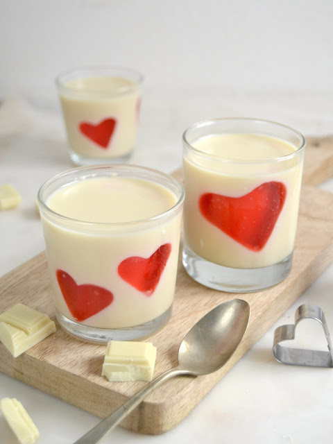 Esta primera receta la tenÃa ya pendiente desde el año pasado, cuando la vi en Pinterest. Me gusto la idea porque por una parte la panna cotta de chocolate blanco tenÃa que estar buenÃsima y por otro lado porque la idea de la decoración con corazones me parecio super bonita ¿A que si"