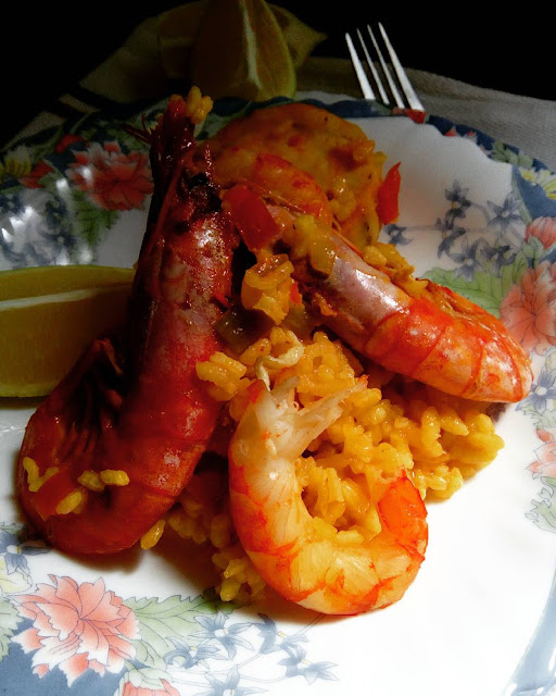 FreÃmos los gambones en una sartén con AOVE y con sal gorda.Pelamos los gambones y guardamos las cáscaras, con ellas hacemos un caldo de marisco.SofreÃmos la cebolla, el diente de ajo y los pimientos (picados todos) y añadimos sal, pimienta, dos pastillas de caldo de pescado y la cúrcuma.Mezclamos y añadimos el arroz y los gambones.Añadimos el caldo y cocinamos hasta que el arroz esté en su punto. Enplatar y Enjoy it!