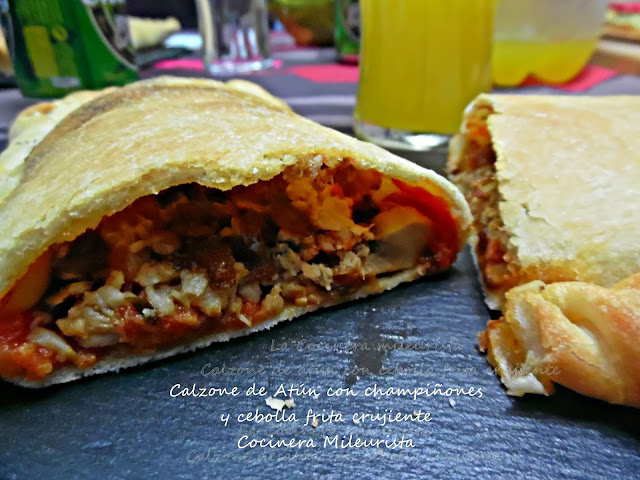 Calzone de Atún con champiñones y cebolla frita crujiente