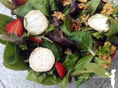 - 1 bolsa de preparado con brotes (canónigos, espinacas, lechugas...)- 250 g de fresas- 150 g de nueces peladas- 200 g de queso de cabra