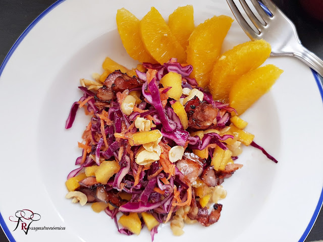 Color y sabor tiene también mi ensalada. Versión de esta Frisk rødkålssalat med appelsin og mandler (Ensalada de repollo rojo fresco con naranja y almendras ) que he copiado al Chef danés Claus Meyer.