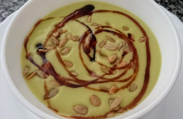 Pelar el aguacate y el pepino, batir junto al zumo de limón. Añadir el AOVE y la sal. Incorporar agua según la textura que queramos. Dejar en nevera y esperar que este muy frÃo. Al punto de servir añadir las pipas y un chorreón de balsámico de frambuesa.