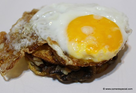 ELABORACIÓN: poner aceite en una sartén para freÃr las patatas (papas) o calentar la freidora para introducirlas. En otra sartén, rociar un poco de aceite de oliva virgen y hacer los champiñones con un poco de sal. Cuando los champiñones y las patatas estén cocinadas, freÃr los huevos. En casa nos gustan con poco aceite en la sartén, para que estén lo menos grasientos posible. Luego, solo queda montar el plato poniendo una base de patatas, otra de champiñones, otra de patatas y el huevo encima, por ejemplo. Esto ya es a gusto del consumidor. CONSEJOS: * Si quieren que la receta tenga menos calorÃas, guisar las patatas y cortarlas después en rodajas o asarlas al horno.* Los champiñones, si no les agradan, se pueden cambiar por otra verdura al gusto, por ejemplo, calabacÃn en rodajas a la plancha.* En vez de hacer las patatas en rodajas, optar por un nido de patatas paja.* Evitar que la cáscara del huevo toque la sartén para evitar problemas de salud. Hay que recordar que la cáscara...