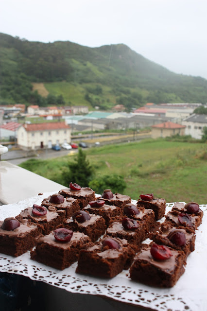 Ingredientes, uso un molde cuadrado de 22x22 o uno redondo, el que prefiráis pero apto para micro:-125 gr de azúcar, usé panela, le da un toque acaramelado irresistible, y en su defecto azúcar moreno, y ya si no, blanco -125 gr de chocolate postres-125 gr de aceite de oliva suave -3 cucharadas de leche-3 huevos-80 gr de harina (si queréis usar el bizcocho para rellenar una tarta como la que vais a ver a continuación, puse 100 gr )-medio sobre de levadura-cobertura: chocolate con leche, dos puñados de pepitas, no lo pesé-cerezas (la combinación con el chocolate es deliciosa) Derretimos el chocolate al microondas. En un bol batimos los huevos con el azúcar, sin más, sólo hasta mezclar, de hecho uso unas varillas en toda la receta, no hace falta más.Añadimos las 3 cucharadas de leche y la levadura y removemos bien para quitar los posibles grumos (también puede echarle la levadura con la harina al final), el aceite y el chocolate fundido. Removemos bien y por último la harina hasta que esté todo bien integrado. Vertemos sobre el molde elegido, el mío era de silicona y sólo unto un poco de aceite, pero si es de cristal poned también un poco de harina. Ahora lo metemos al mi...
