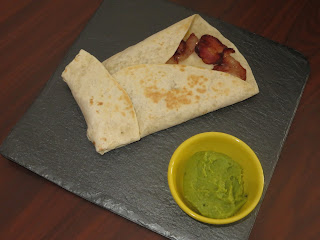 A continuación, enrollamos el wrap como más os guste y lo pasáis por la sandwichera o por una plancha y ya está listo para servir. En este caso lo he acompañado con guacamole, aunque podéis elegir la salsa que más os guste.
